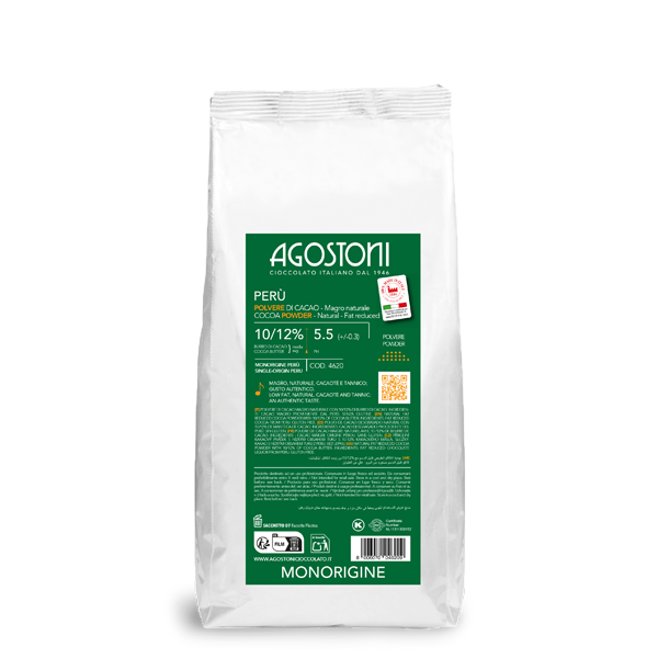 Polvere di cacao monorigine Perù, magra e non potassata, cacaotè e tannico, per un gusto intenso e autentico di cacao.