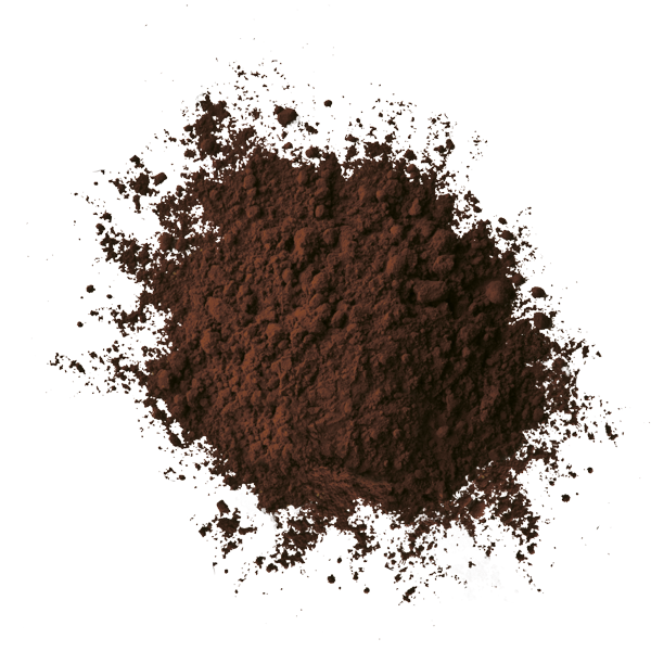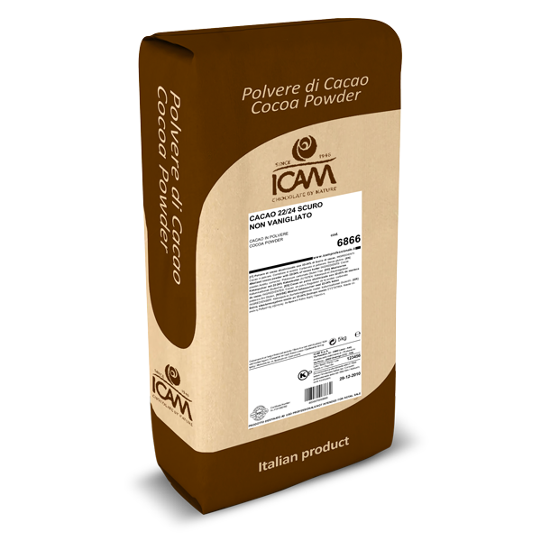 Polvere di cacao fortemente alcalinizzata (pH 8), con 22/24% di burro di cacao. Colore rosso bruno molto scuro.
