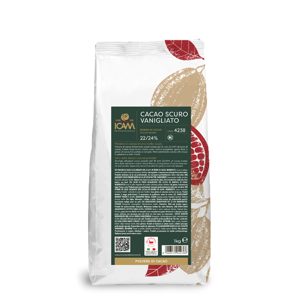 Polvere di cacao fortemente alcalinizzata (pH 8), con 22/24% di burro di cacao e colore rosso bruno molto scuro.