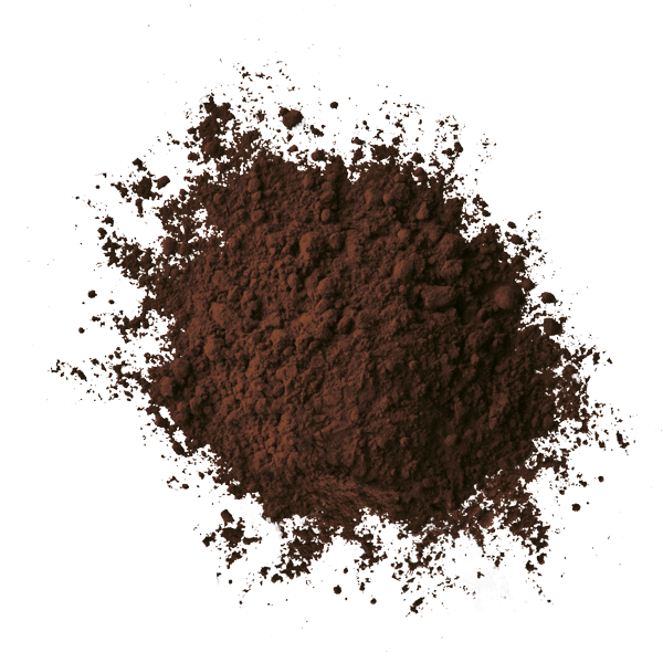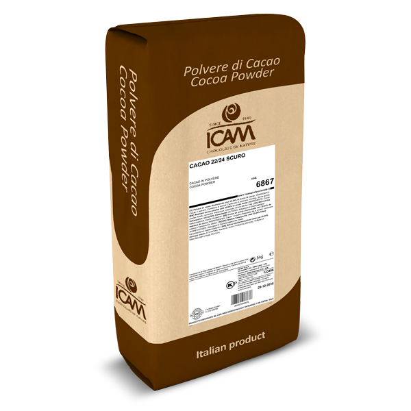 Polvere di cacao fortemente alcalinizzata (pH 8), con 22/24% di burro di cacao. Colore rosso bruno molto scuro.